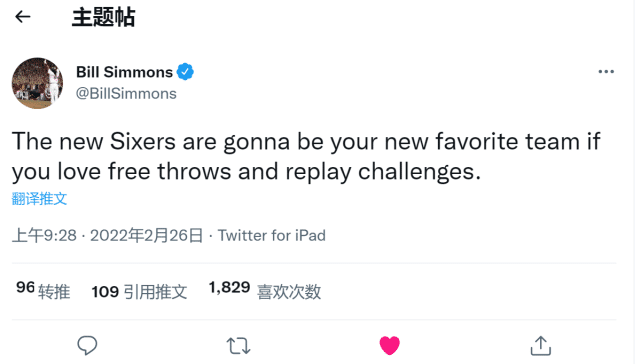 而名记比尔西蒙斯则是调侃:如果你喜欢看罚球和回放挑战,那么这支全新的76人会是你最喜欢的球队。