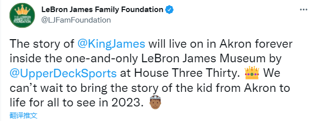 詹姆斯家庭基金会正式宣布,勒布朗-詹姆斯博物馆将于2023年在阿克伦揭幕,官推写道:詹姆斯的故事将永远留在阿克伦的詹姆斯博物馆内,我们迫不及待地想在 2023 年让所有人都看到那个来自阿克伦的孩子的故事。