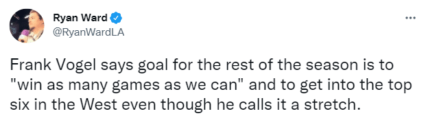 目前湖人27胜31负仅排名西部第九,剩余24场比赛湖人队赛程难度西部第一和联盟第三,谈到接下来的目标,沃格尔表示湖人队的目标是杀进西部前六,尽可能多地赢得比赛。如果不能达成这样的目标,沃格尔希望湖人能排在第7或者第8位,避免一场就被淘汰。