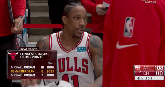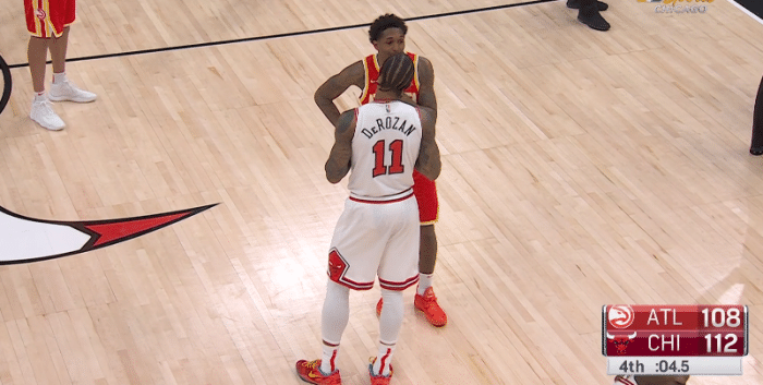 第二节德罗赞贡献6分,第三节仅拿3分,但拉文第三节独砍12分;末节德罗赞连续打进三球,之后老鹰反扑并且反超比分,关键时刻最后46秒,德罗赞无解中投,之后迎着防守投进达成不讲理2+1,德罗赞连得5分并且完成制胜一击,此时德罗赞坐在地板上怒吼庆祝,公牛主场再次沸腾了。