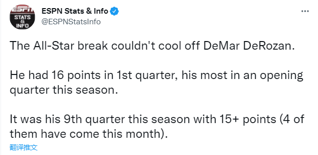 美媒晒德罗赞首节16分的疯狂表现,发推写道:全明星赛无法让德罗赞冷静下来,单节16分创他本赛季首节的最高分,这是他本赛季第 9次单节 15+ ,本月已经4次做到。