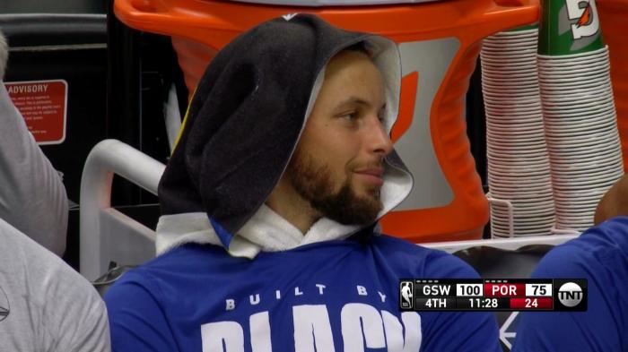 末节库里不再上场,比赛早早沦为练兵的垃圾时间,最终勇士客场大胜开拓者;库里身穿蓝色长袖T恤,头上包着毛巾,面带微笑观战,提前打卡太轻松。