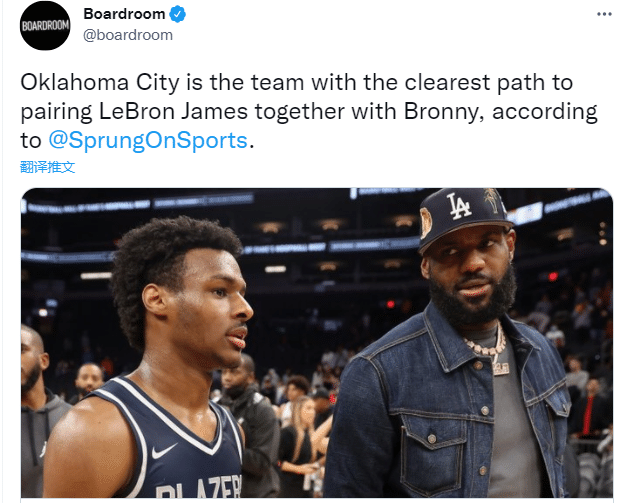 来源:JRS直播02-23 11:04JRS直播02月23日讯 詹姆斯生涯最后一年会为哪支球队效力?据美媒Boardroom报道,俄克拉荷马雷霆最可能是詹姆斯和布朗尼搭档的球队,美媒晒出詹姆斯和布朗尼身穿雷霆球衣的P照;目前雷霆未来7年拥有19个首轮选秀权和16个次轮签,此前詹姆斯曾直言普雷斯蒂(雷霆总经理)是雷霆队MVP。
