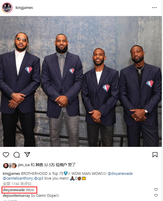 来源:JRS直播02-22 11:24JRS直播02月22日讯 ,湖人球星勒布朗-詹姆斯晒出风尘四侠&香蕉船四兄弟的最新合影,晒照并且配文写道:兄弟们都入选了75大球星,哇哦兄弟们,爱你们!韦德在评论区留言,也惊呼哇哦(WOW)。