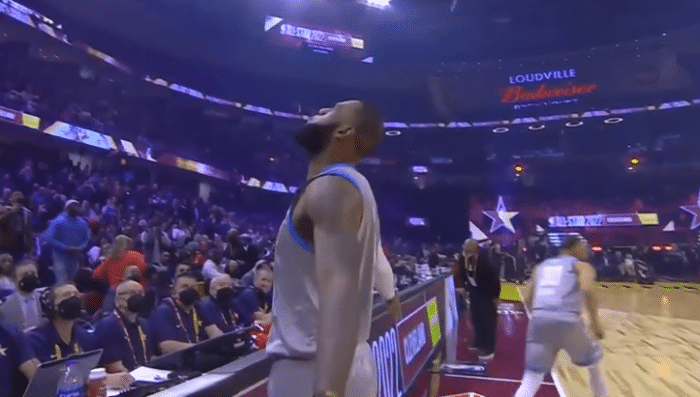现场介如詹姆斯的时候,四届总冠军,四届MVP,四届FMVP,18届全明星,来自阿克伦的孩子,洛杉矶湖人队勒布朗-詹姆斯,现场的观众爆发出了巨大的欢呼声,随后詹姆斯振臂欢呼,大吼向观众回应。詹姆斯队首发:詹姆斯、字母哥、库里、德罗赞、约基奇,杜兰特队首发:莫兰特、维金斯、塔图姆、恩比德、特雷杨。