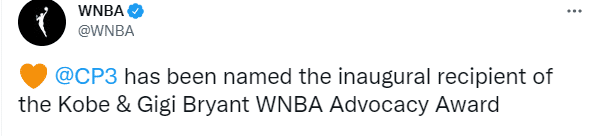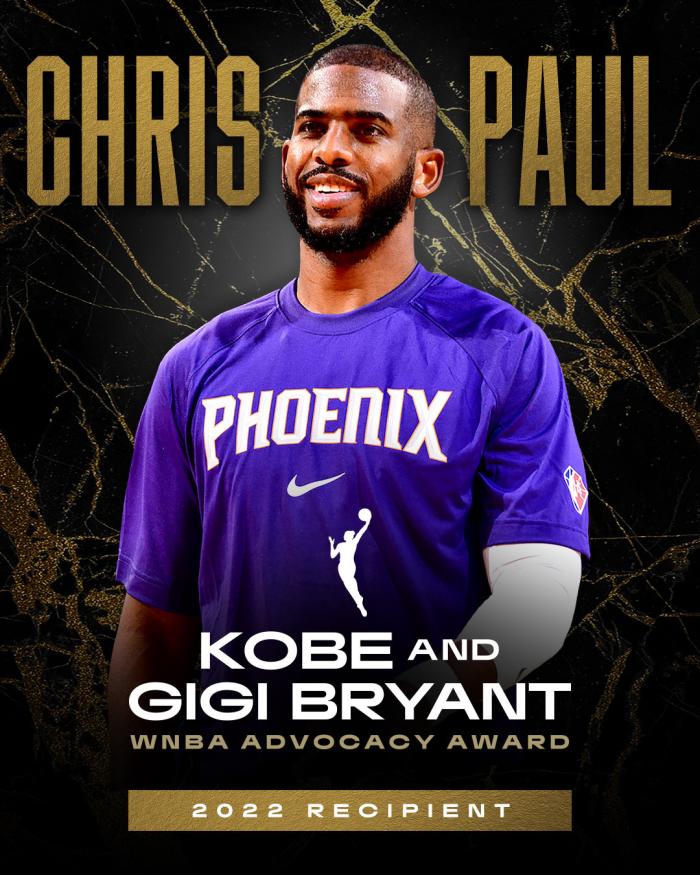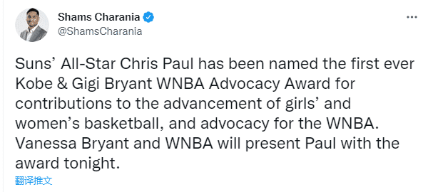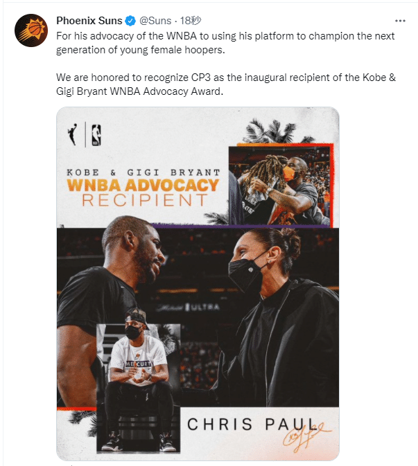 太阳官方也祝贺保罗获奖,晒照并发推写道:我们很荣幸地宣布CP3是科比和吉吉·布莱恩特 WNBA 宣传奖的首届获奖者。