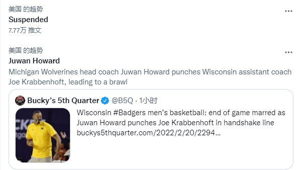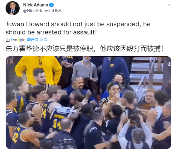 来源:JRS直播02-21 11:33JRS直播02月21日讯 ,在密歇根大学与威斯康星大学的一场比赛后,场边发生恶劣冲突以及大规模斗殴事件,密歇根大学主教练朱万-霍华德击打对方助教的脑袋引发火爆冲突;朱万-霍华德殴打对手这件事冲上推特热搜引热议,美记直言他该因殴打而被捕。