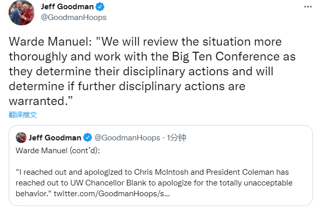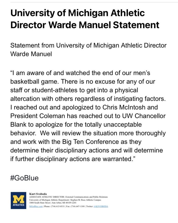 密歇根大学体育主管Warde Manuel公开发表声明:无论煽动因素如何,我们的任何工作人员或学生运动员都没有任何借口与他人发生肢体冲突,我们为这种完全不可接受的行为道歉;我们将更彻底地审查这件事并与十大联盟合作,从而确定是否有必要采取进一步的纪律处分。