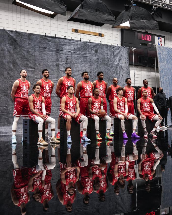 来源:JRS直播02-21 11:26JRS直播02月21日讯 ,NBA2022年全明星周末最后一天,万众瞩目的全明星正赛来了,赛前詹姆斯队和杜兰特队拍摄定妆照和合影,杜兰特因祖母去世而缺席,杜兰特队玩疯了,恩比德、特雷-杨等球星在更衣室中赌博,维金斯等人看牌凑热闹。