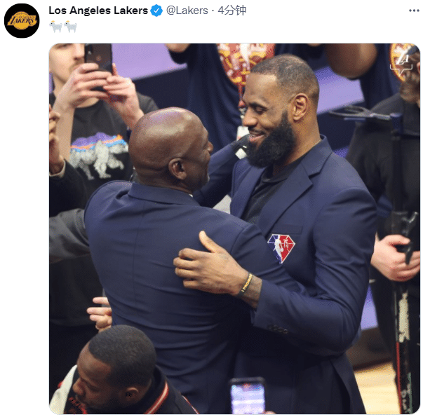 75大球星亮相期间,詹姆斯和公牛名宿罗德曼聊起来,还和库里、安东尼、保罗等人合影留念,詹姆斯还和乔丹紧紧拥抱,两人有说有笑乐开怀,乔帮主甚至趴进詹姆斯的怀抱中,如此画面太罕见;湖人官方晒出乔詹合影,配上两个山羊表情。