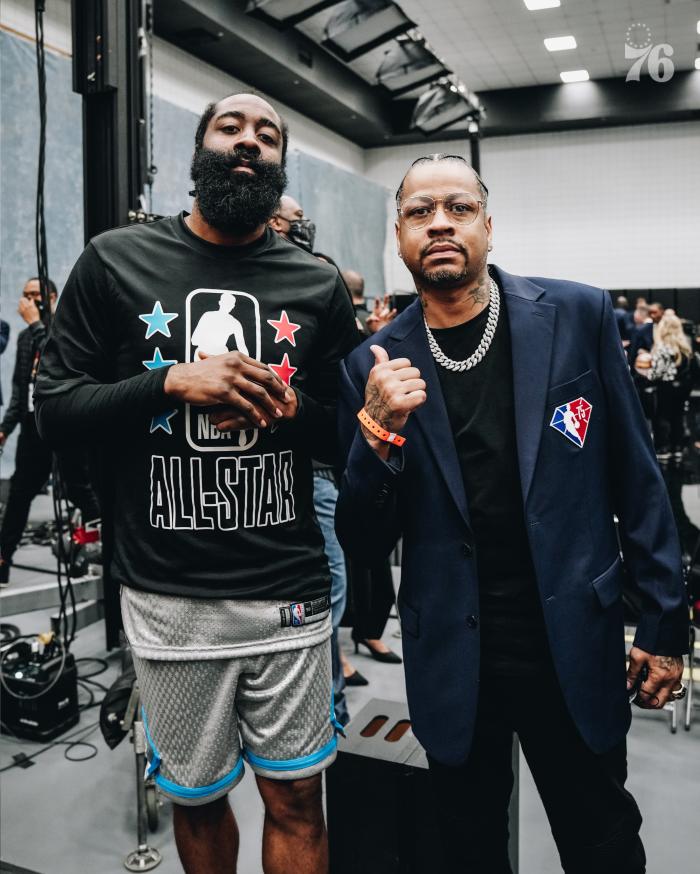 哈登亮相时,骑士主场响起响亮的嘘声;目前哈登已经是一名76人队球员,此前他和篮网之间的离队事件引发巨大争议;赛前,哈登来到杜兰特更衣室,和恩比德拥抱寒暄;哈登还参加75大球星合影,以及和76人名宿艾弗森合照。