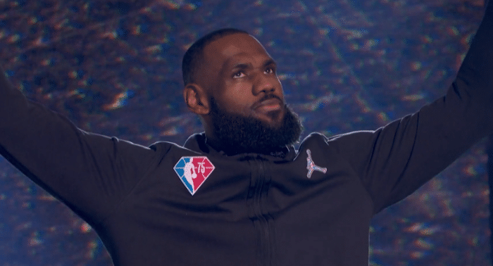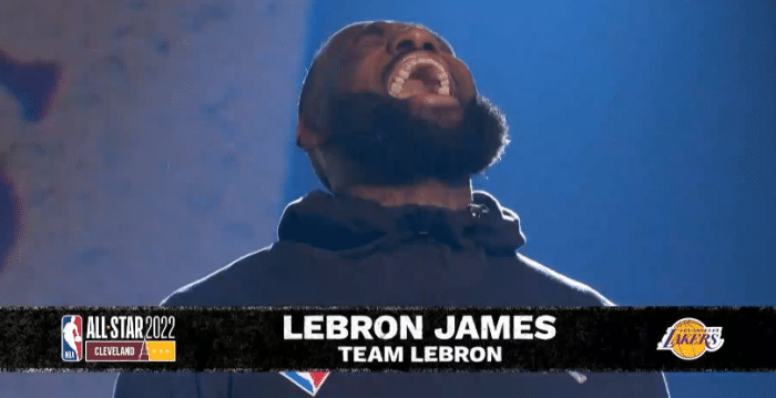 杜兰特队率先亮相,恩比德是杜兰特队最后一个被介绍的球星;之后詹姆斯队众将亮相,主帅蒙蒂-威廉姆斯率先被介绍,之后入场的球星顺序依次是米切尔、哈登、加兰、阿伦、范弗利特、东契奇、巴特勒和保罗;首发阵容的入场顺序是约基奇、德罗赞、库里、字母哥和詹姆斯。