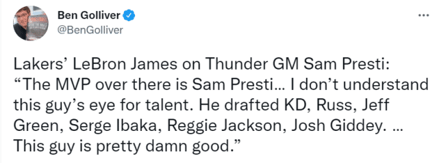 他还称赞了雷霆的总经理普雷斯蒂。“那支球队的MVP是萨姆-普雷斯蒂。我不明白这家伙到底对天赋有怎样的眼光。他选中了杜兰特、威少、杰夫-格林、伊巴卡、雷吉-杰克逊、吉迪,这家伙真是太棒了。”很快有球迷发现,詹姆斯列了一大堆名字,并没有提及哈登。还有美媒认为詹姆斯夸普雷斯蒂,也是对湖人总经理佩林卡的一种不满。