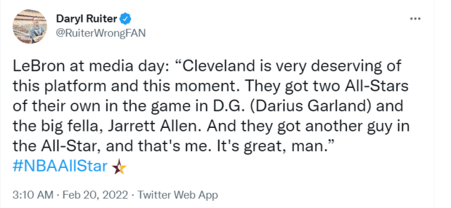 谈到克利夫兰举办今年的全明星,詹姆斯说:“克利夫兰值得拥有这样的时刻,他们自己拥有两个全明星:D.G.(加兰)和大个子贾内特-阿伦,他们在这届全明星还拥有另一个家伙,那就是我。这很棒,兄弟。”詹姆斯的这番言论很快引起热议,毕竟,他现在的身份是湖人球星,当然,他率领克利夫兰骑士拿到过队史第一座总冠军,也是事实。