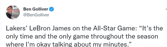 詹姆斯还调侃说全明星赛是自己唯一不会抱怨上场时间的比赛。赛季至今,詹姆斯为湖人出战41场,场均出场时间达到36.8分钟,对于一位37岁的老将来说,这确实太累了。加盟湖人后,最近三次参加全明星,詹姆斯的出场时间都在下降,2019年全明星,詹姆斯打了26分32秒,2020年全明星,他打了18分48秒,而去年全明星,詹姆斯只打了13分钟。