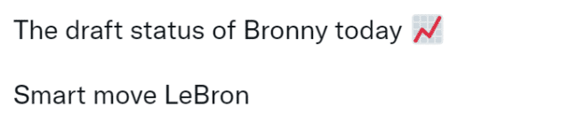 有美媒认为詹姆斯太聪明,这样一句话,就可以让布朗尼的选秀顺位飙升。此前,布朗尼的表现一般,外界预测他甚至可能无法在首轮被选中,但现在,如果选中布朗尼意味着可以至少得到老詹一年的使用权,想想退役那年的关注度,这绝对是超值的。