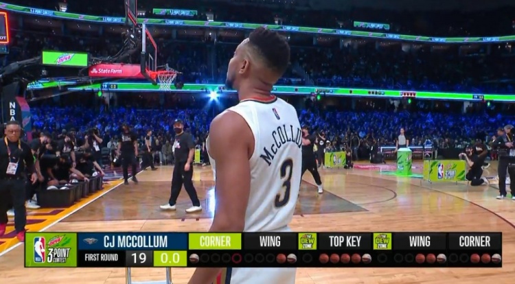 第二个出场的是CJ-麦科勒姆,第一个点投进3球拿到4分,不过2个超远未进,第三个点表现出色,但最后一个彩球车仅进1球,共拿到19分。