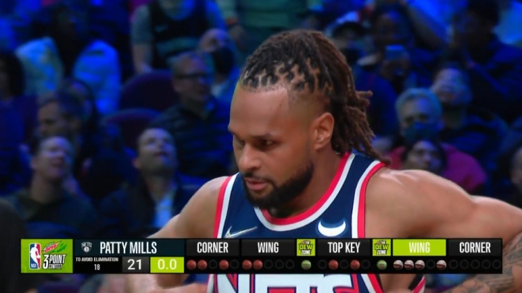 第五个出场的是帕蒂-米尔斯,第一个点全部偏出,随着手感热起来,第二个彩球车投入4球,超远2个全部命中,最后一车投入3球,共拿到21分。