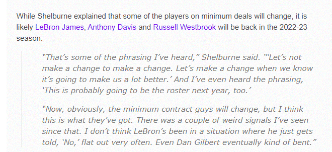 Ramona Shelburne在节目中表示:这是我最近听到的一些说法。湖人不会为了改变而改变,当知道改变会让球队变得更好时,他们才会做出改变。我甚至还听到了这样的说法,今年湖人的核心阵容名单可能就是下赛季的。