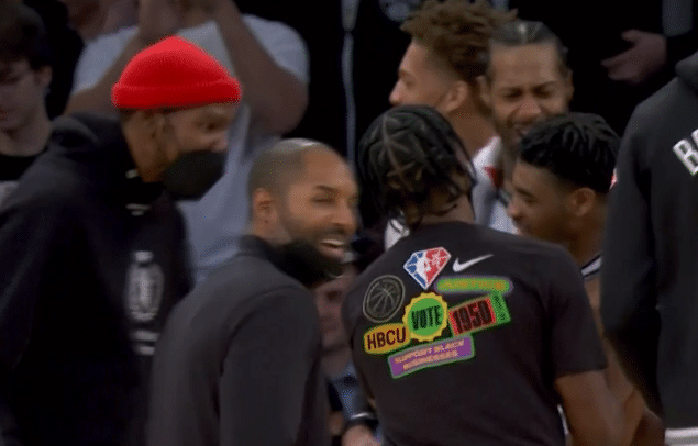 上半场,杜兰特和西蒙斯紧挨坐在替补席,由于篮网落后被压制,他们一脸严肃和不开心;下半场,场上局势风云突变,篮网疯狂反扑,杜兰特兴奋地早已坐不住,站在场边为队友加油,当托马斯投进不讲理制胜三分时,杜兰特为他激情庆祝。