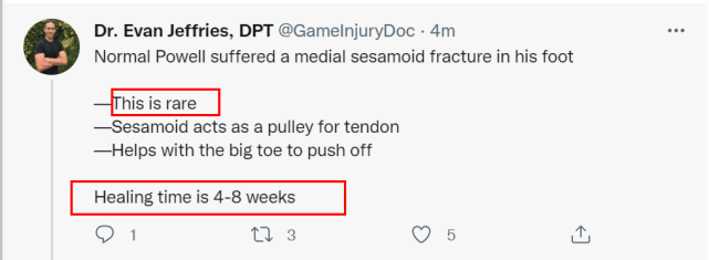 鲍威尔是在2月11日对独行侠一战的第三节中受伤的,当时他突破上篮后,摔出底线,随后一瘸一拐地离开了球场。