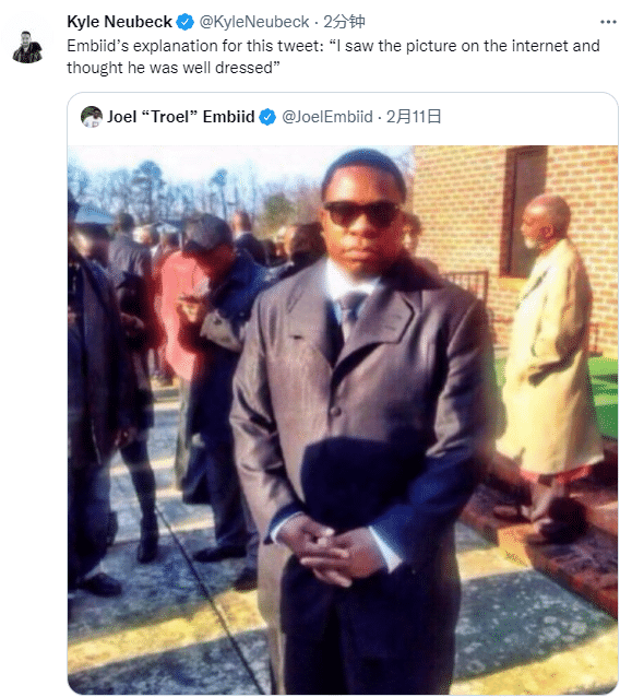恩比德解释此前的争议推文:我在网上看到了这张照片,觉得他穿着得体,穿的挺帅的。