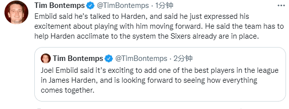 谈到引援哈登,恩比德表示:詹姆斯-哈登是联盟中最优秀的球员之一,这很令人兴奋和激动,你得到这样的球员,你的夺冠几率会更大;恩比德还说他已经和哈登谈过了,并表示他只是表达了对与哈登一起前进的兴奋,他说球队必须帮助哈登适应76人队已经建立的体系。