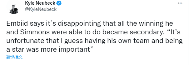 恩比德回应西蒙斯离队,我很高兴我不会再回答有关该主题的任何问题;恩比德还表示:令人失望的是他和西蒙斯能够取得的所有胜利都是次要的,不幸的是,我认为他更想拥有自己的球队和成为全明星。