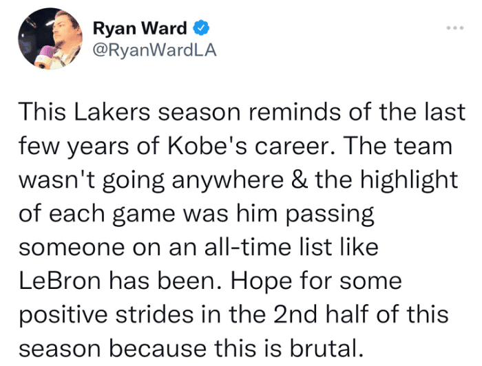 湖人表现不佳,这也遭到了记者的抨击:这个湖人赛季让人想起科比职业生涯的最后几年。球队没有方向,每场比赛的亮点都是詹姆斯超越各种记录。希望在本赛季后半段取得一些积极进展,因为这是残酷的。