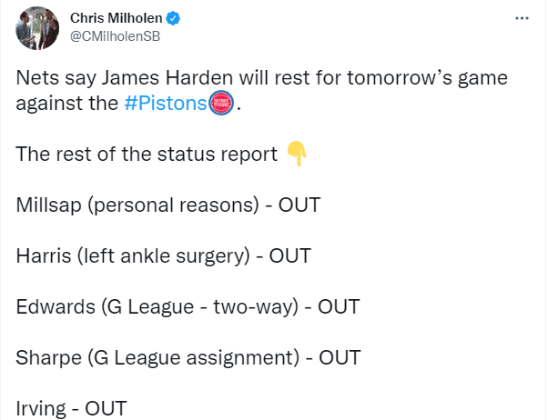 哈登确定缺战活塞,欧文仍旧被无限期禁赛,米尔萨普和乔-哈里斯也无法出战,杜兰特有望打出疯狂一战,单核带队冲击连胜,继续捍卫东部第一的位置,而活塞遭遇11连败,4胜21负排在东部倒数第一,这应该是哈登轮休的一大原因。