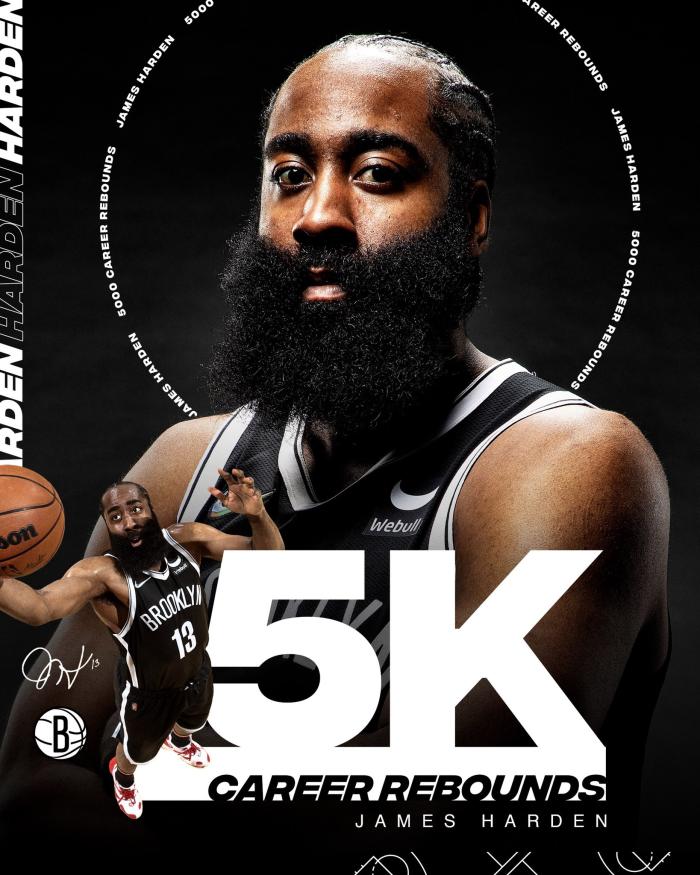 上一场击败篮网,哈登生涯篮板数正式突破5000次大关,成为NBA历史上第一位20000分+5000篮板+5000助攻+2500三分的球员。