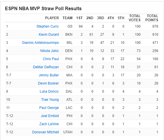 来源:JRS直播12-11 11:04JRS直播12月11日讯 近期,权威美媒ESPN邀请100位媒体成员,投票预测谁能夺得本赛季MVP,在这一次的模拟结果中,库里获得94张第一选票,总共978分力压杜兰特高居第一,杜兰特和字母哥分列第二和第三名,而湖人队0票,没有人获得选票。
