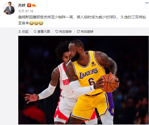 詹姆斯伤停,湖人暂时成为威少的球队,苏群老师这番话真是扎心浓眉。