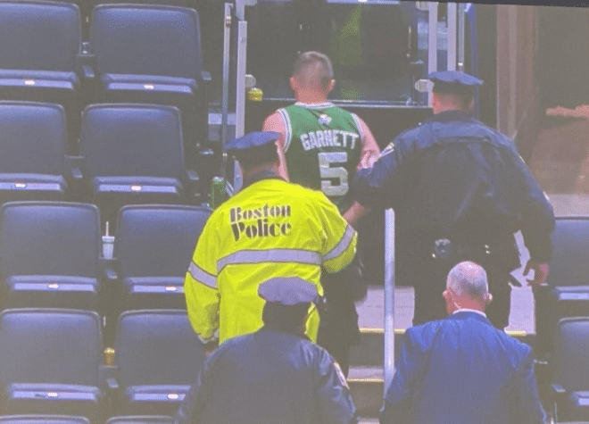 本场比赛赛后也是发生了十分不和谐的一幕,在欧文离场的时候,有凯尔特人球迷朝欧文扔水瓶,好在是水瓶没有砸到欧文,欧文没有受伤,这位凯尔特人球迷的做法遭到了球迷的怒斥,上场比赛来到凯尔特人的主场,欧文也是遭遇到了巨大的嘘声,拿球就被球迷嘘,上一场比赛欧文也失常了,今天的比赛欧文再次遭遇全场狂嘘,但是他用自己出色的发挥回应了全场的嘘声,今天的比赛欧文出场时间全场最高40分32秒,24中11,三分12中6,罚球11中11,拿到39分,还有11篮板2助攻2抢断。名记更新社交媒体,朝欧文扔水瓶的球迷已经被警方带走了。被抓的这位球迷穿的是加内特的球衣,加内特成了球迷的热点,躺枪啊。