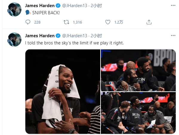 来源:JRS直播04-09 11:48JRS直播4月9日讯 篮网巨星詹姆斯-哈登更新动态,晒出三张合影并且发推写道:我告诉兄弟们,如果我们打得好的话,天空才是我们的极限;哈登还专门发推写道:高呼杜兰特回来了!(SNIPER狙击手是杜兰特的绰号);篮网官方转发哈登的动态。