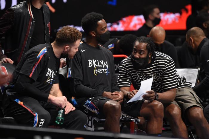 哈登发推晒出三张合影,第一张是哈登和杜兰特同框,当时杜兰特捂着毛巾咧嘴大笑;第二张合影是哈登身穿便装,坐在替补席拿着战术板,欧文抱着哈登开怀大笑;第三张是哈登给格里芬看技术统计的数据,两人交谈十分认真。
