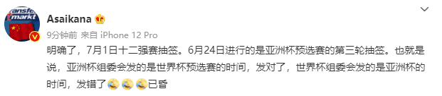 JRS直播讯朱艺在微博上写道:“明确了,7月1日十二强赛抽签。6月24日进行的是亚洲杯预选赛的第三轮抽签。也就是说,亚洲杯组委会发的是世界杯预选赛的时间,发对了,世界杯组委会发的是亚洲杯的时间,发错了,已昏。 ”