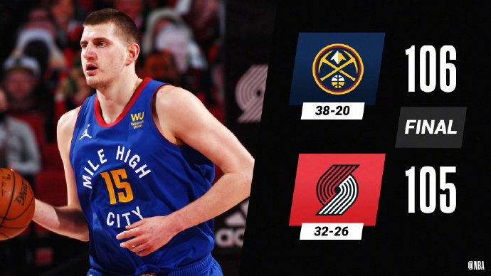 掘金(38-30):约基奇25分9篮板5助攻,小波特17分5篮板2助攻,戈登12分6篮板3助攻2断,巴顿14分7篮板4助攻,坎帕佐12分5篮板3助攻,米尔萨普9分3篮板2助攻,多齐尔7分6篮板2助攻