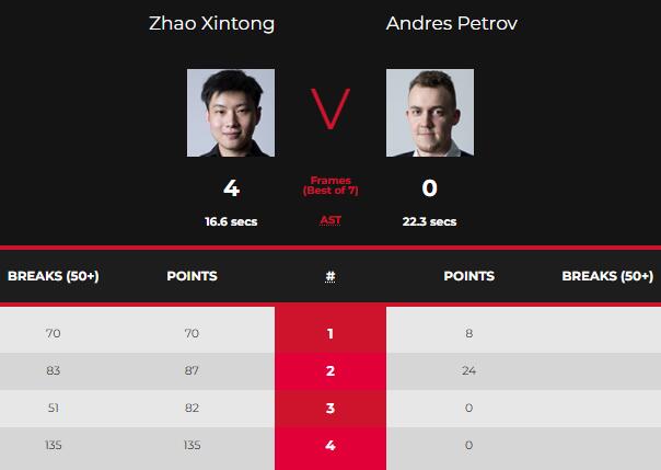 比赛进入第二局,佩德罗夫率先打进红球获得上手机会,但是他在仅仅拿到24分之后就因为击球犯规而被罚4分,并给赵心童留下远台进攻机会。赵心童拼进红球成功获得上手机会,随后直接凭借单杆轰出83分的表现以87:24拿下此局比赛的胜利从而以2-0继续领先佩德罗夫。第三局,赵心童率先打进红球上手,但由于没有好机会而放弃进攻,随后佩德罗夫再次失误,赵心童再次打进红球上手,随后只能选择母球沉顶库防守。佩德罗夫薄球失误被罚4分,赵心童打进左侧底袋红球上手,在拿到25分之后因为叫位不佳而防守。最终,赵心童凭借单杆51分以82:0拿下此局比赛的胜利从而以3-0领先佩德罗夫拿赛点。