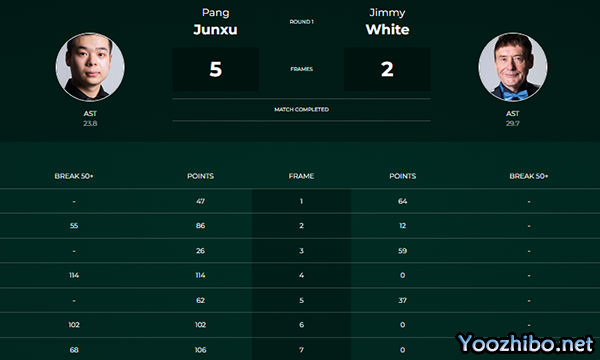 第一局,庞俊旭错失机会,怀特多次上手64-47险胜,大比分1-0领先。第二局,庞俊旭单杆55分、86-12回敬,1-1。第三局,怀特59-26险胜,2-1再次领先。