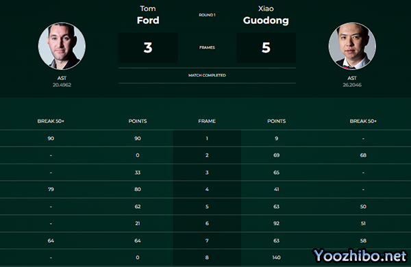 首局比赛中,肖国栋率先拿到9分出现失误,随后汤姆福德单杆打出90分以90:9拿下此局比赛的胜利成功取得1-0的领先。
