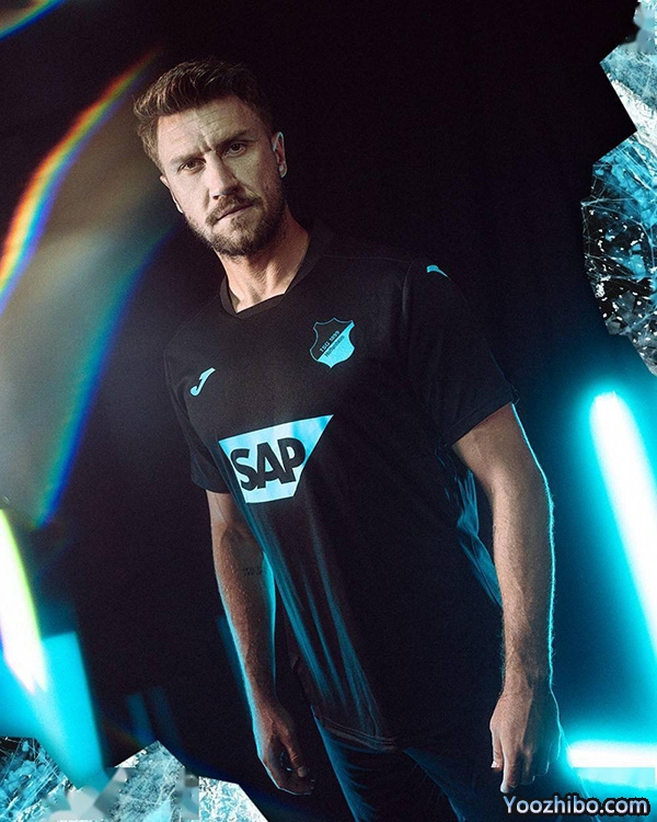 深蓝色罗纹V领与袖口将勾勒出清晰的球衣轮廓,同时队徽采用与球衣配色相同的设计,而Joma Logo以及球衣广告也以深蓝色呈现。与新赛季主场球衣一样,俱乐部口号“TSG IST BEWEGUNG”(TSG是一项运动)同样出现在背后衣领下方。