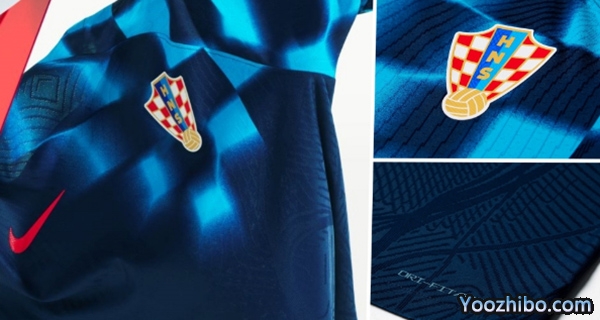 2022卡塔尔世界杯克罗地亚客场球衣保持了他们近些年的客场球衣颜色蓝色。球衣上半部分印有蓝黑色的格纹,但格纹采用了渐变模糊的效果。所以看起来就像是海水的波纹一样,给人一种神秘感又时尚。