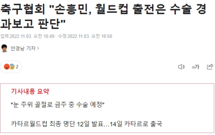 JRS直播11月03日讯 韩国足协官方消息,孙兴慜是否参加世界杯将在手术后评估。