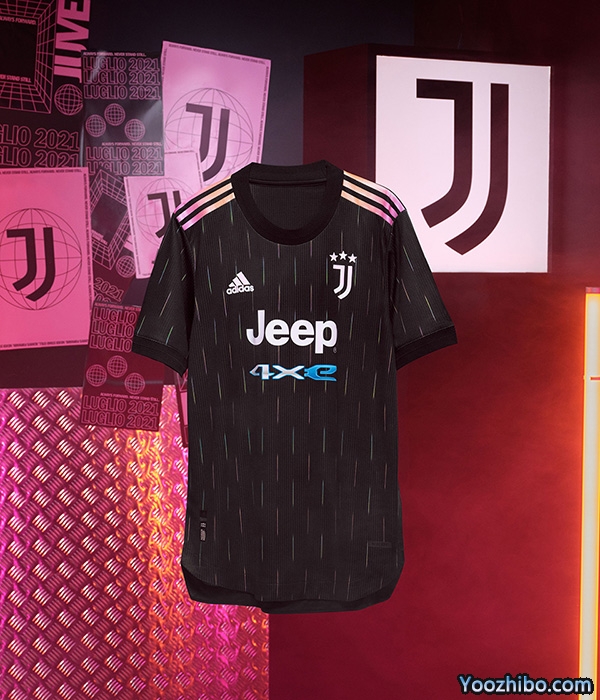 2021-22赛季尤文图斯客场球衣借鉴了年轻的亚文化和生活方式,将经典的黑色基调与色彩缤纷的装饰线条相结合,同时将俱乐部比赛日和节日夜晚的灯光融入面料之中,同时向尤文图斯标志性的球衣颜色致敬。